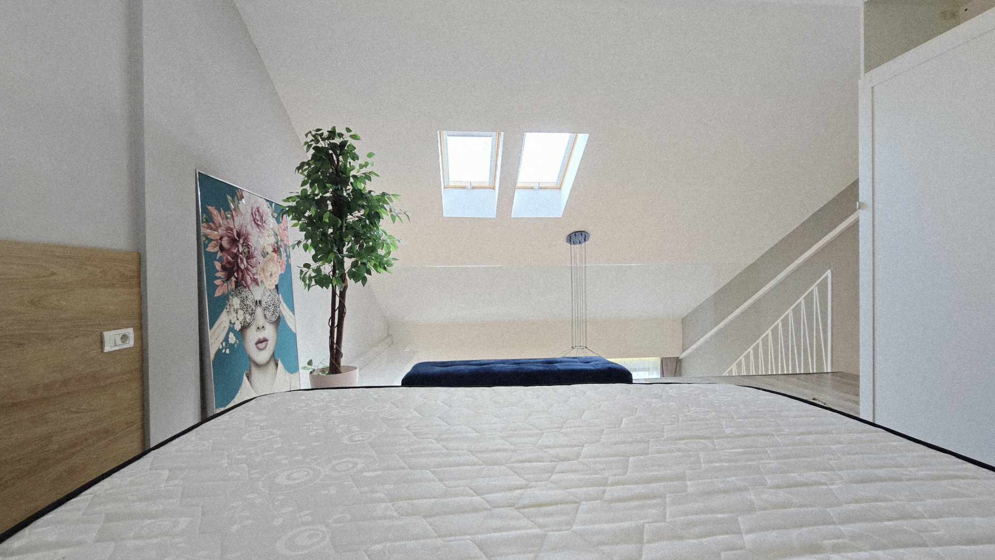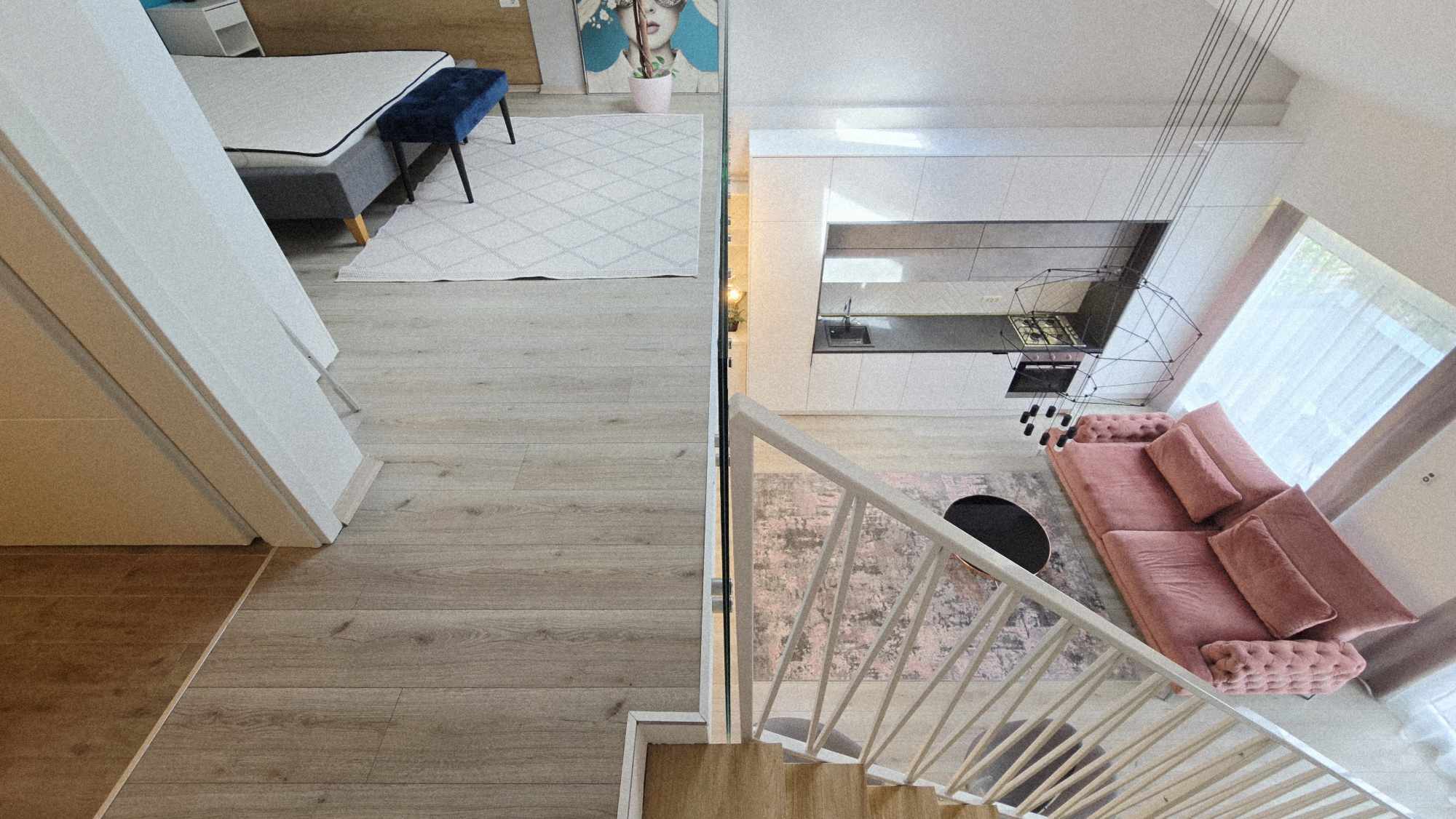 Ideal amenajat, apartamentul este dispus pe o suprafata construita de 77 mp si o suprafata utila de 60 mp , este de tip loft, fiind compus din: hol cu intrare directa in camera de zi ce are iesire in balcon si se afla in spatiu deschis impreuna cu bucataria iar partea de sus cuprinde un dormitor spatios si o baie, cu acces pe scara interioara.
