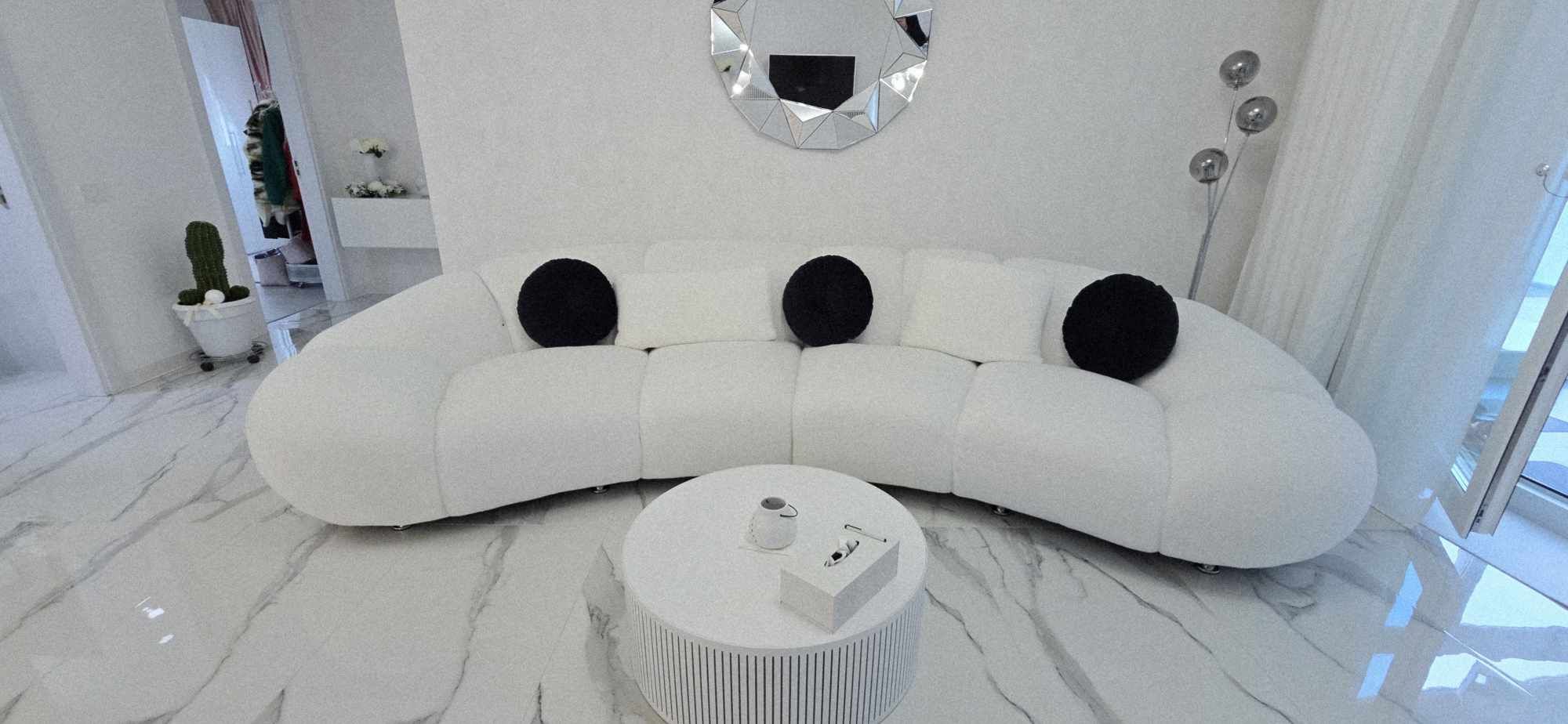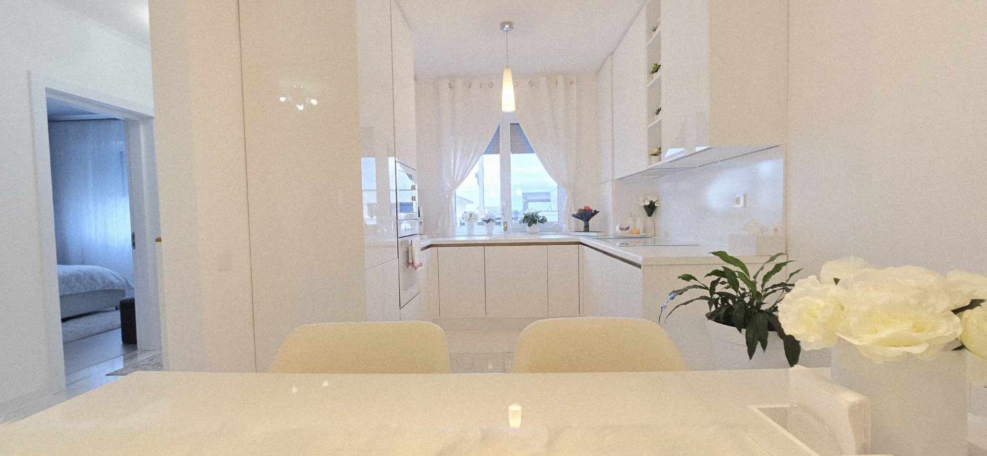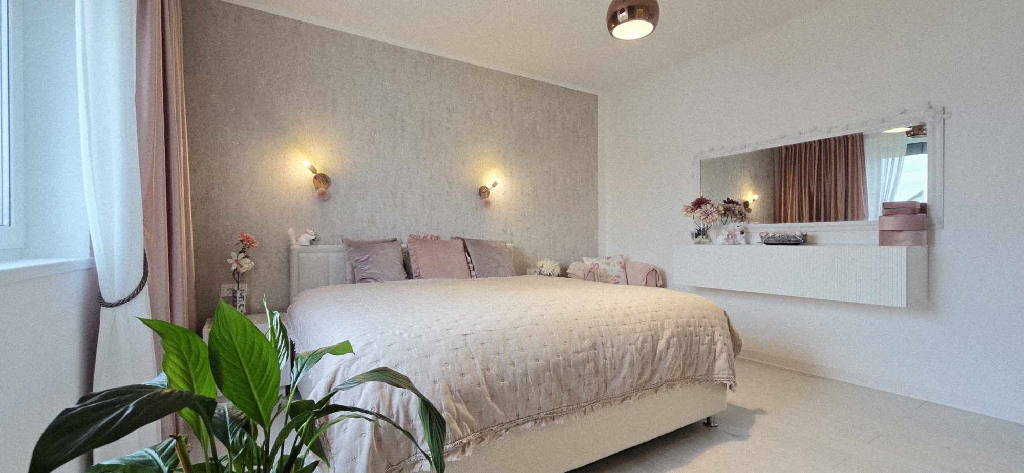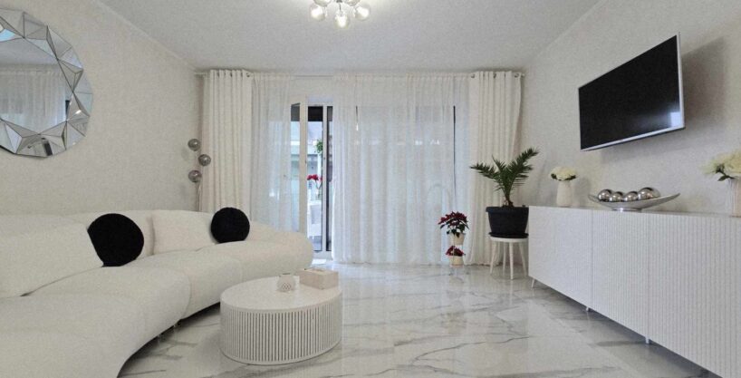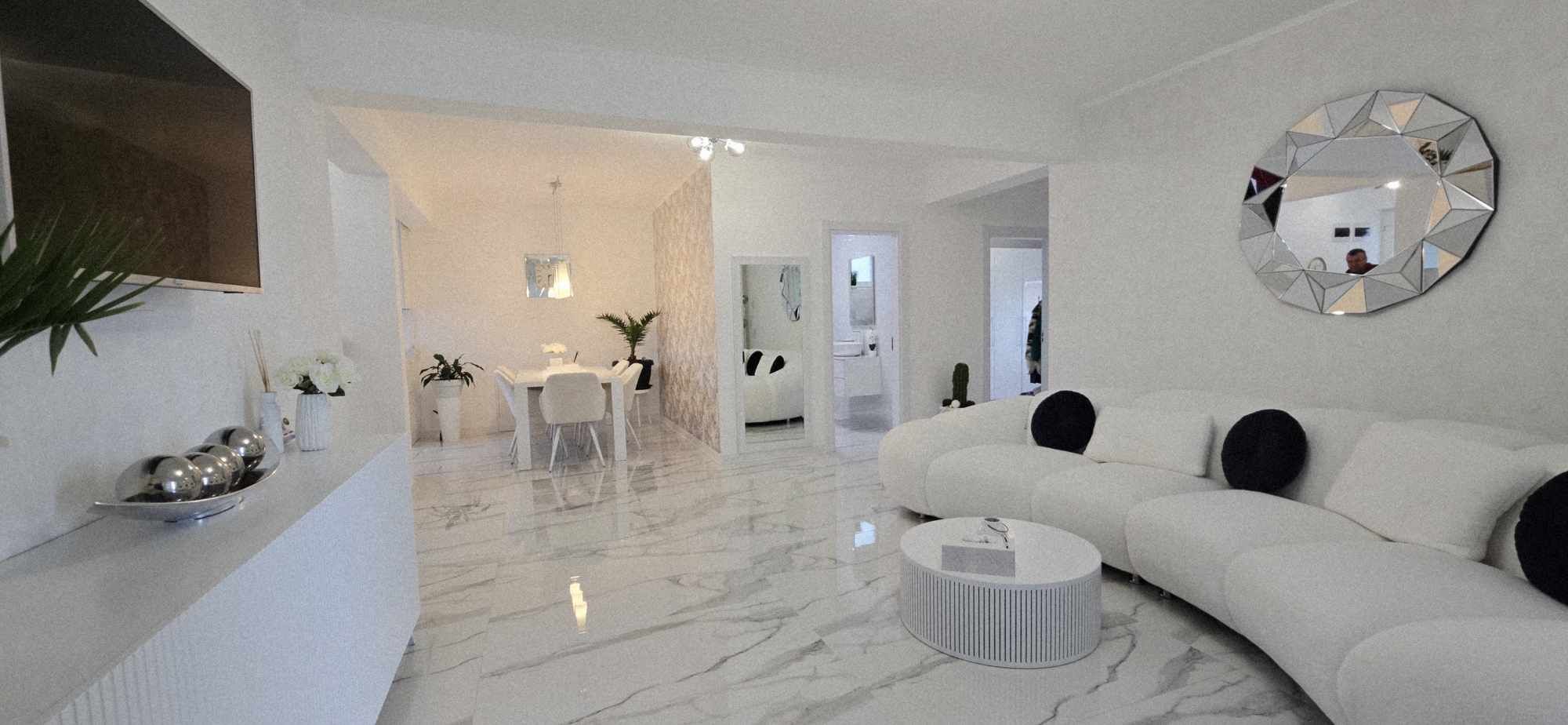 Compartimentarea este foarte bine definită: hol de acces, un dormitor cu orientare stradală, adică sud, unul dintre dormitoare având baie proprie cu intrare directă din dormitor, aceasta fiind baie cu cadă, un dormitor care este mobilat și utilat, folosit ca și dressing, baie mare cu intrare din hol dotată cu cabină de duș, toate camerele fiind decomandate, iar în prelungirea holului spațiu de living orientare Sud – Vest, cu ieșirea în terasa închisă, dar care pe timpul verii unii pereți pot fi retractabili, bucătărie în spațiu semideschis, cu loc de luat masa, mobilierul de bucătărie bine gândit, cu multiple spații de depozitare, generos în compartimentare, electronice și electrocasnice de top.
