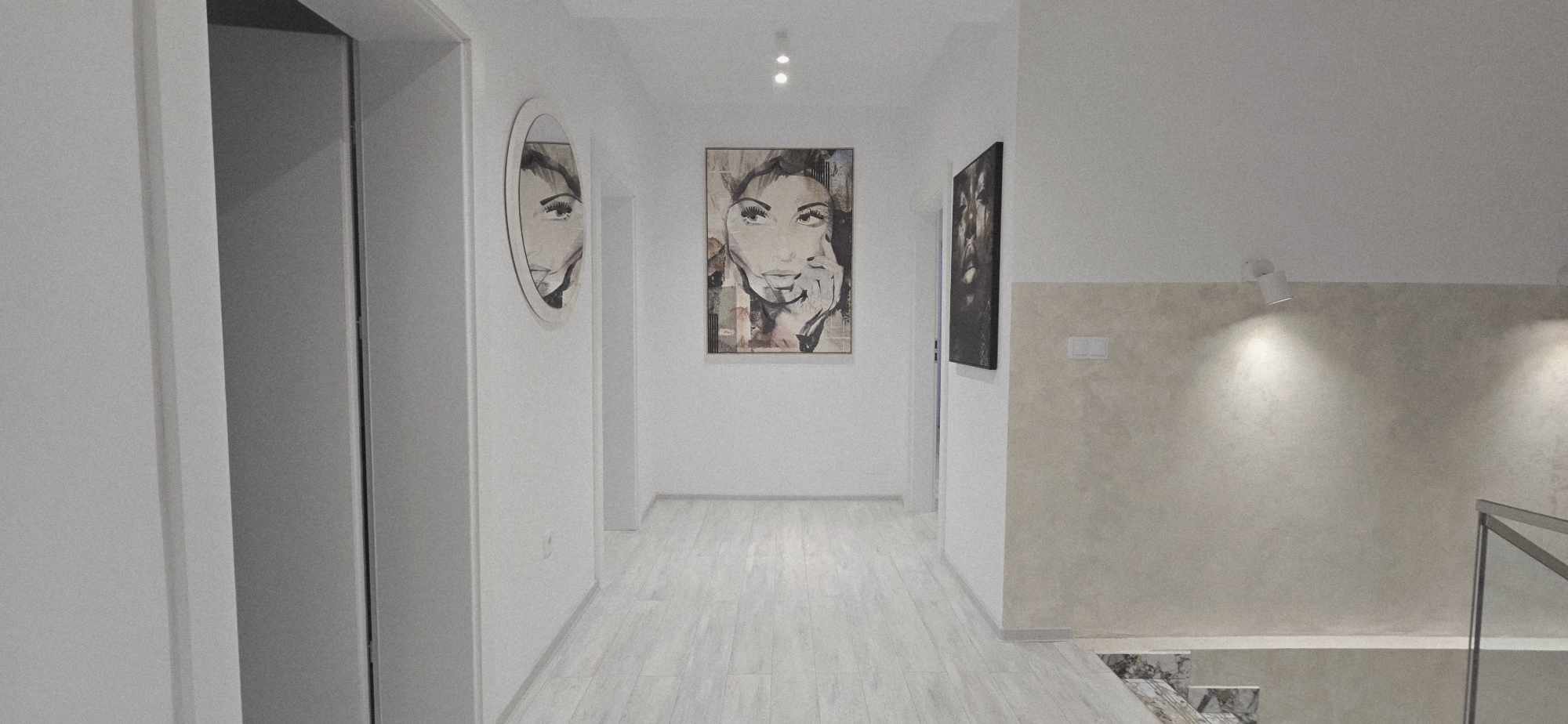 - la etaj regăsim 4 dormitoare, fiecare cu baie proprie, pe diferite orientări , ultrageneroase ca și spațiu, spații de depozitare arhisuficiente, și un hol generos de etaj.