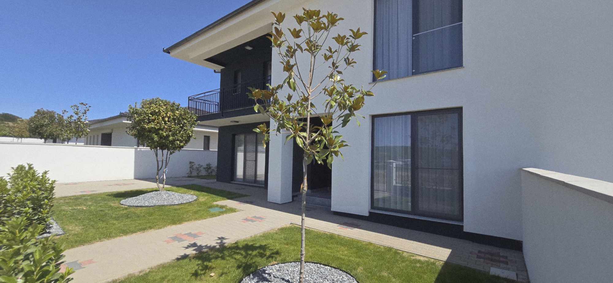 Suprafața terenului aferent este de 420 mp împreună cu amprenta la sol, cu un front stradal generos, în fața casei cât și în curte, avem acces auto și poartă automată, plante ornamentale, spații verzi, sistem de irigație.