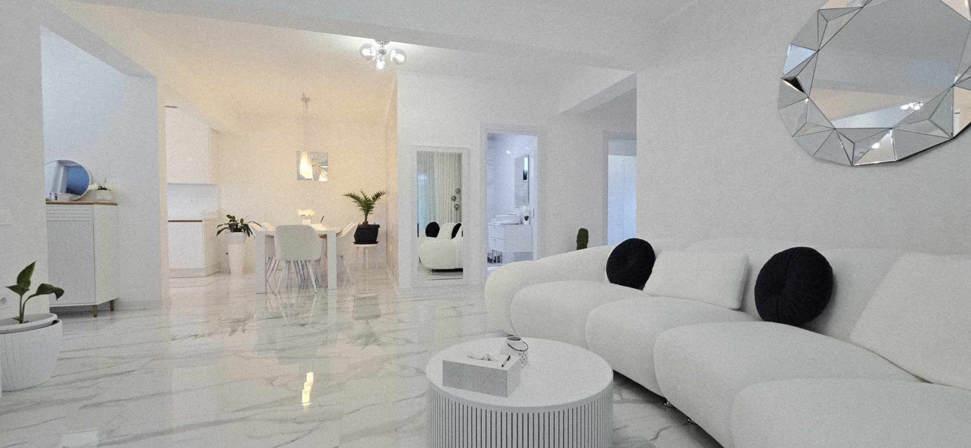 Proiectul este ingenios, cu orientare buna respectiv Rasarit-Sud, constructie pe un nivel,. Compartimentarea este gandita astfel incat holul generos al casei cuprinde partea de intrare, cu doua dormitoare , dressing, iar partea de zi, respectiv living-ul generos, bucatarie, locul pentru luat masa si terasa orientate spre partea de interior a curtii, adica Vest – Nord.