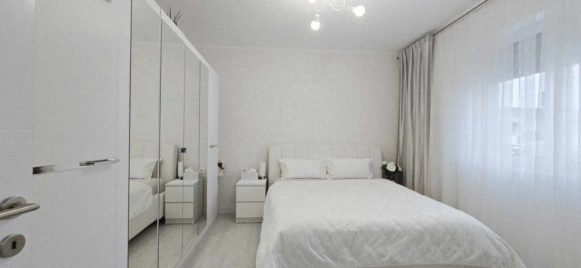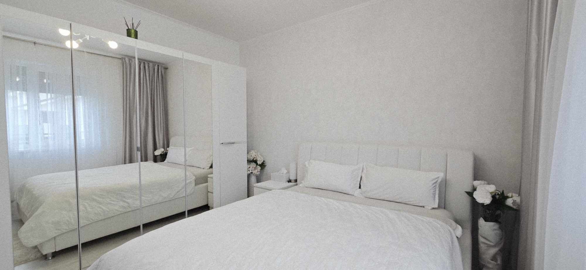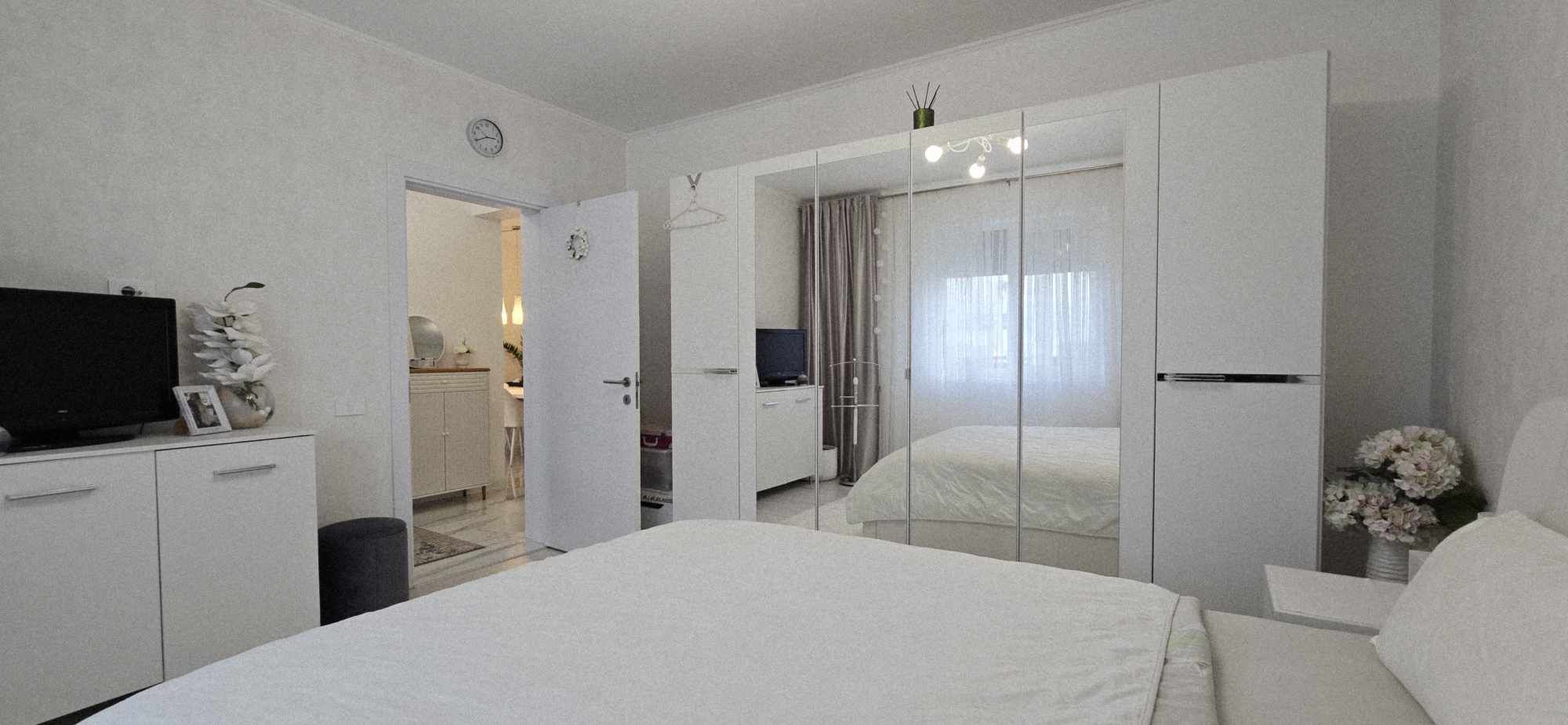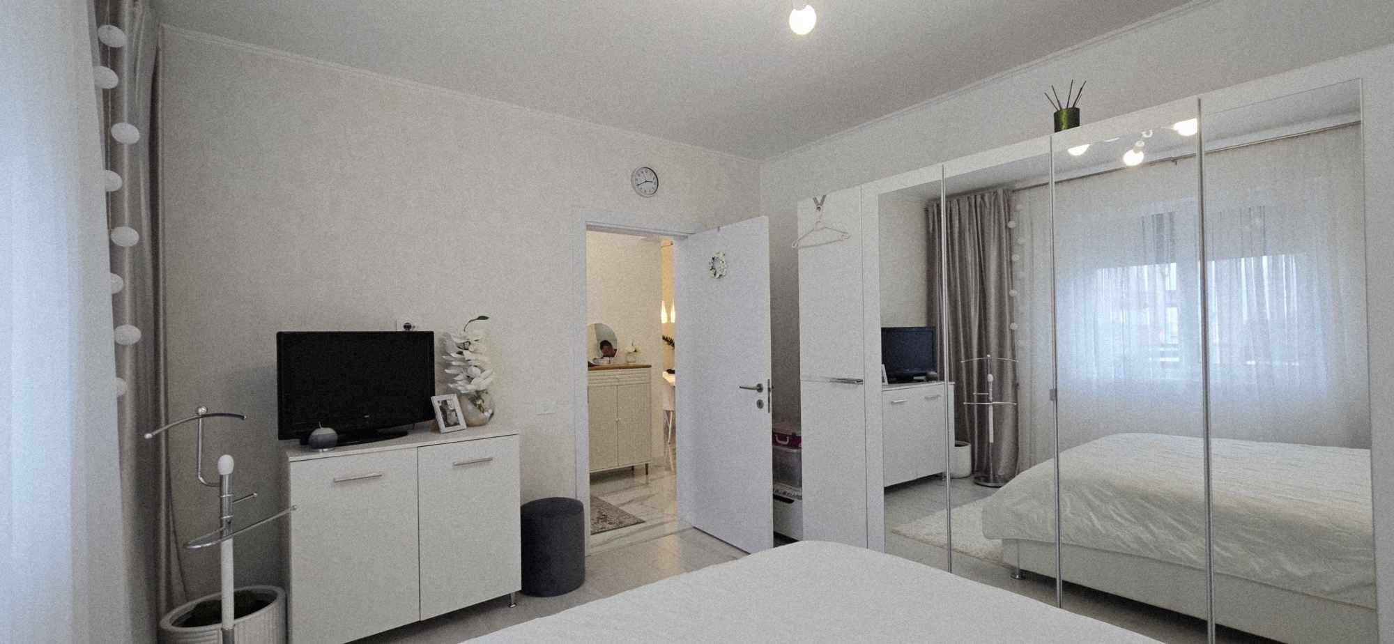 Compartimentarea este foarte bine definita, hol de acces, un dormitor cu orientare stradala, adica sud, unul dintre dormitoare avand baie proprie cu intrare directa din dormitor, aceasta fiind baie cu cada, un dormitor care este mobilat si utilat folosit ca si dressing, baie mare cu intrare din hol dotata cu cabina de dus, toate camerele fiind decomandate iar in prelungirea holului spatiu de living orientare Sud –Vest, cu iesirea in terasa inchisa, dar care pe timpul verii unii pereti pot fi retractabili, bucatarie in spatiu semideschis, cu loc de luat masa, mobilierul de bucatarie bine gandit, cu multiple spatii de depozitare, generos in compartimentare, electronice si electrocasnice de top.