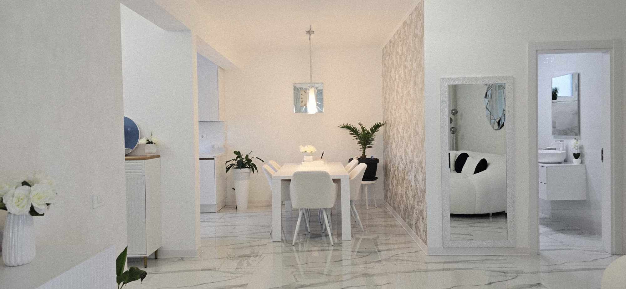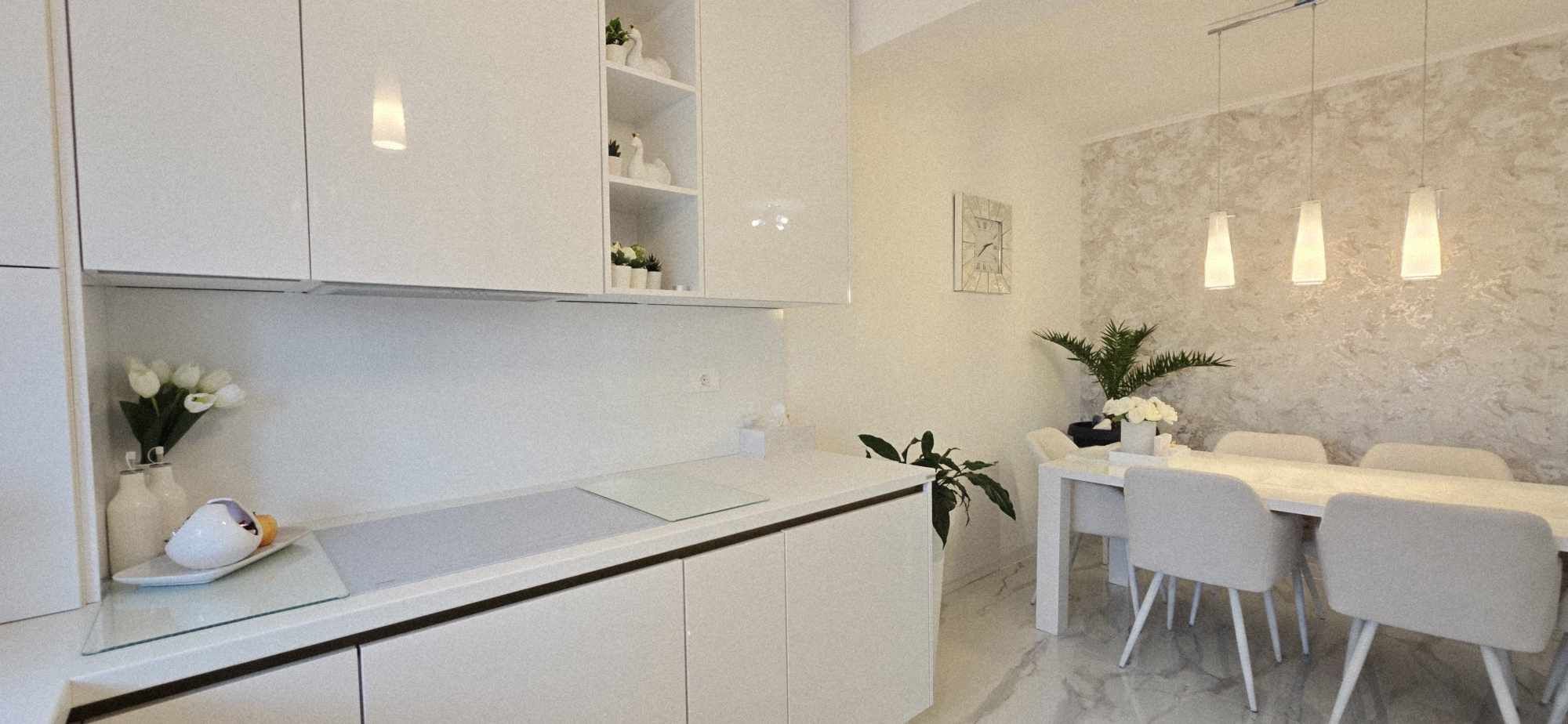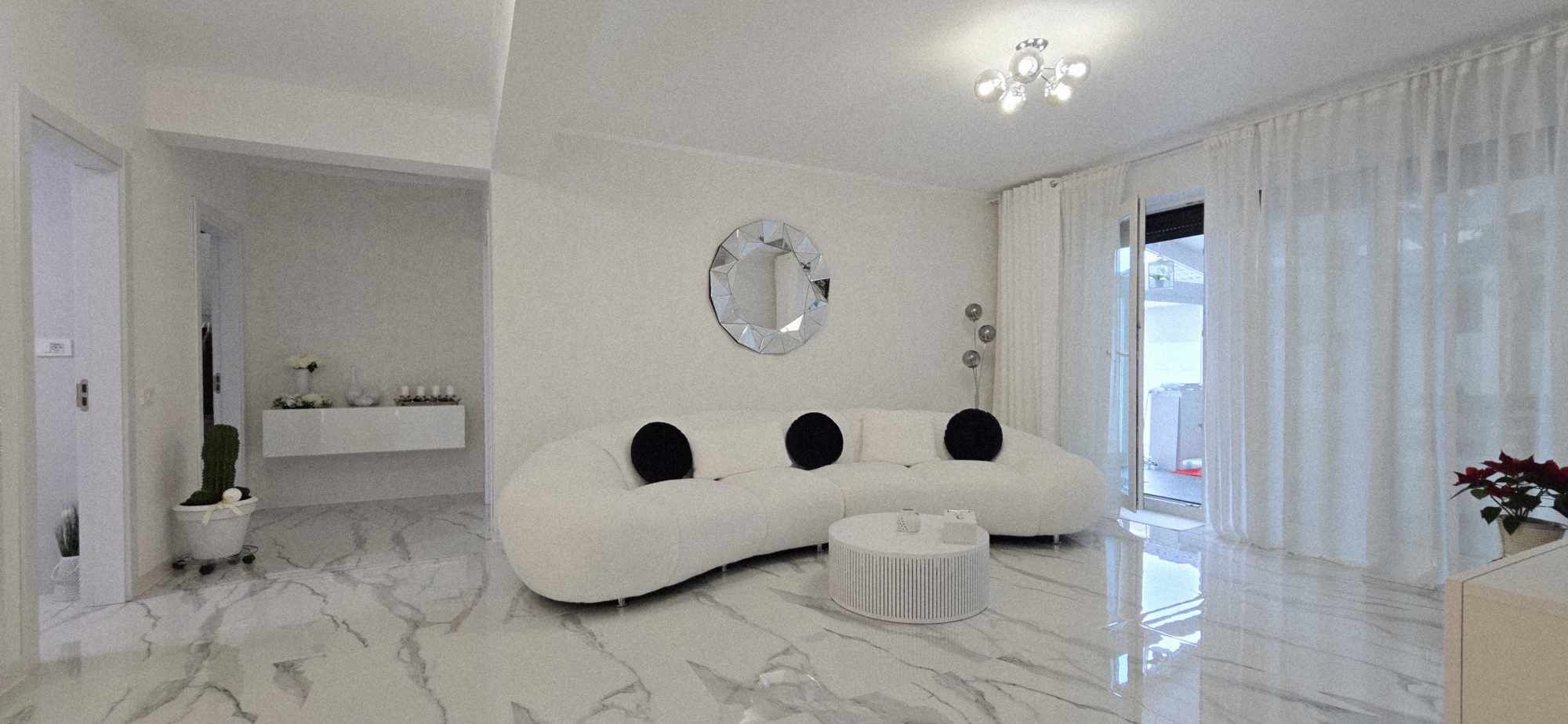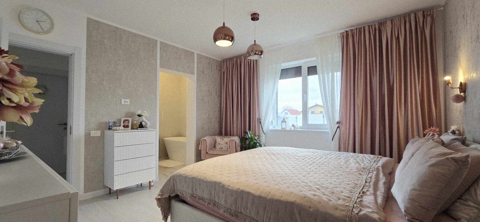 Compartimentarea este foarte bine definita, hol de acces, un dormitor cu orientare stradala, adica sud, unul dintre dormitoare avand baie proprie cu intrare directa din dormitor, aceasta fiind baie cu cada, un dormitor care este mobilat si utilat folosit ca si dressing, baie mare cu intrare din hol dotata cu cabina de dus, toate camerele fiind decomandate iar in prelungirea holului spatiu de living orientare Sud –Vest, cu iesirea in terasa inchisa, dar care pe timpul verii unii pereti pot fi retractabili, bucatarie in spatiu semideschis, cu loc de luat masa, mobilierul de bucatarie bine gandit, cu multiple spatii de depozitare, generos in compartimentare, electronice si electrocasnice de top.