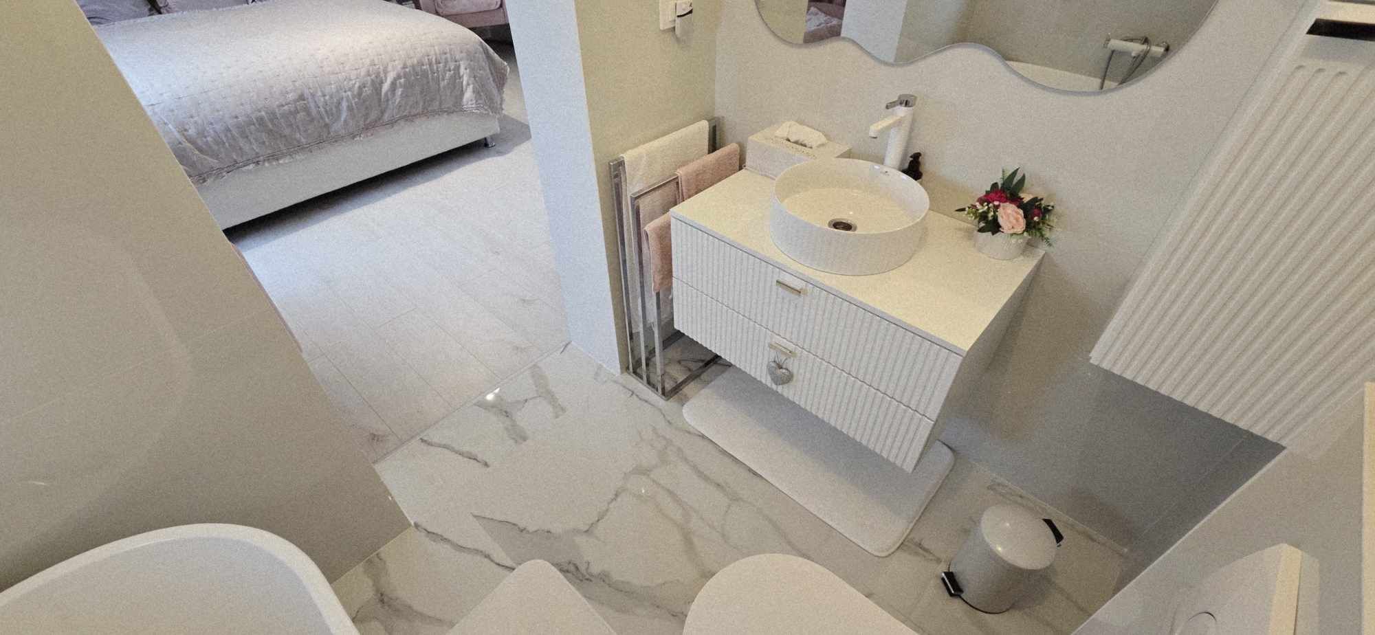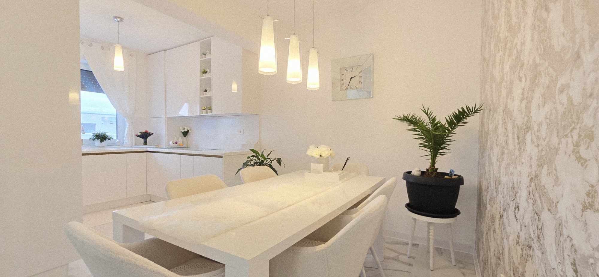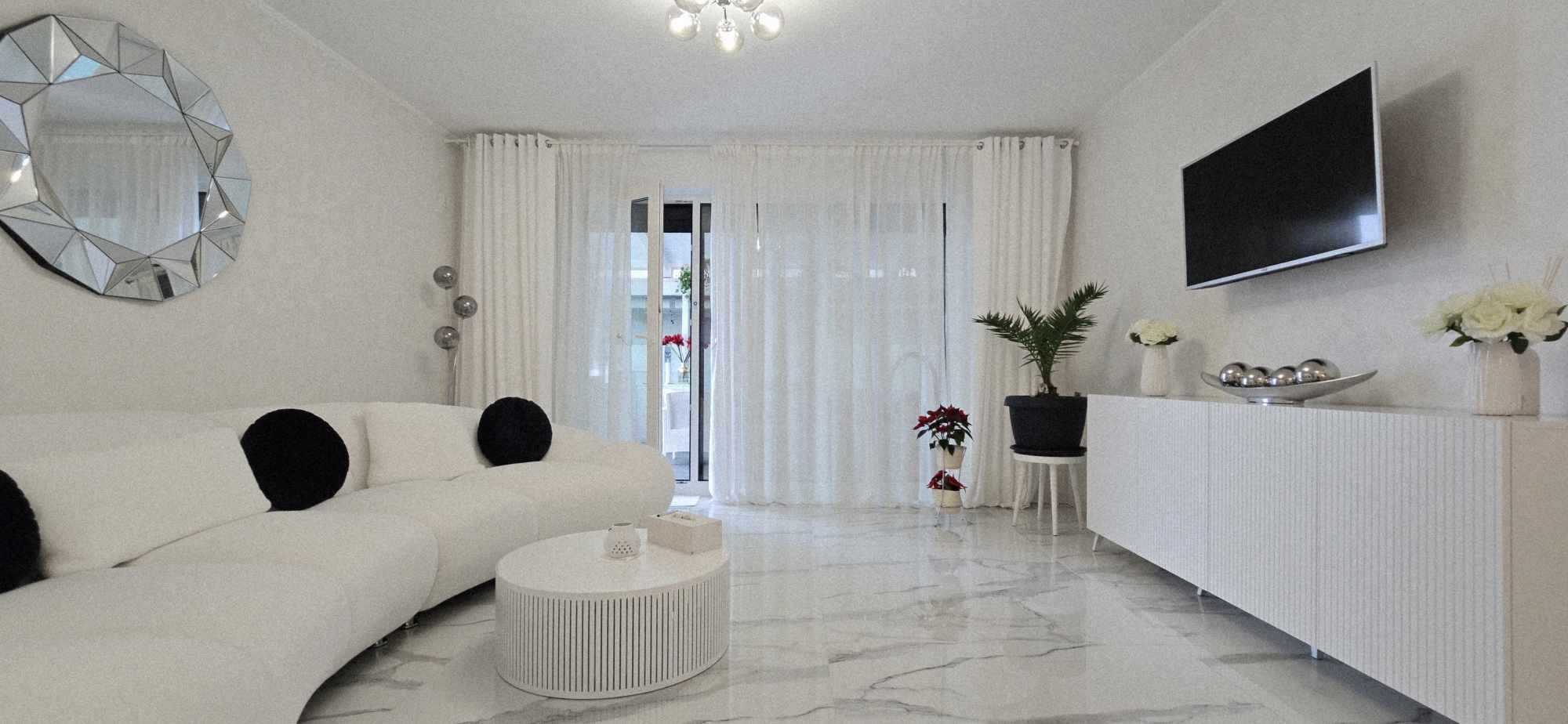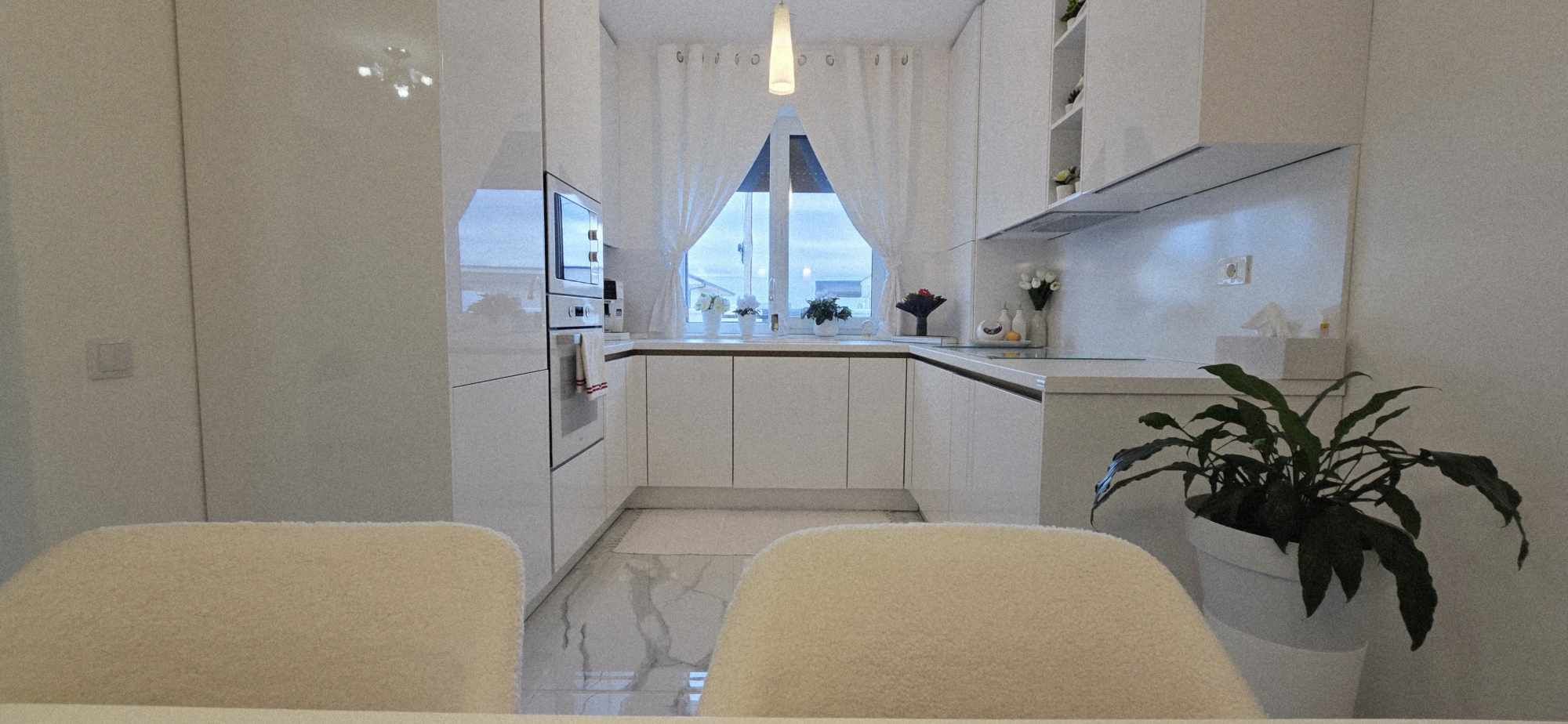 Compartimentarea este foarte bine definita, hol de acces, un dormitor cu orientare stradala, adica sud, unul dintre dormitoare avand baie proprie cu intrare directa din dormitor, aceasta fiind baie cu cada, un dormitor care este mobilat si utilat folosit ca si dressing, baie mare cu intrare din hol dotata cu cabina de dus, toate camerele fiind decomandate iar in prelungirea holului spatiu de living orientare Sud –Vest, cu iesirea in terasa inchisa, dar care pe timpul verii unii pereti pot fi retractabili, bucatarie in spatiu semideschis, cu loc de luat masa, mobilierul de bucatarie bine gandit, cu multiple spatii de depozitare, generos in compartimentare, electronice si electrocasnice de top.