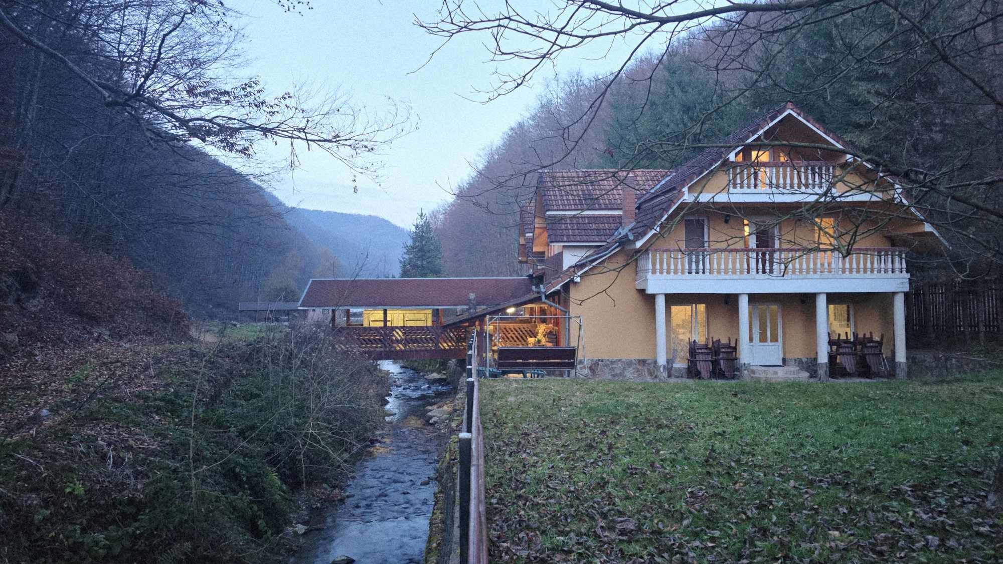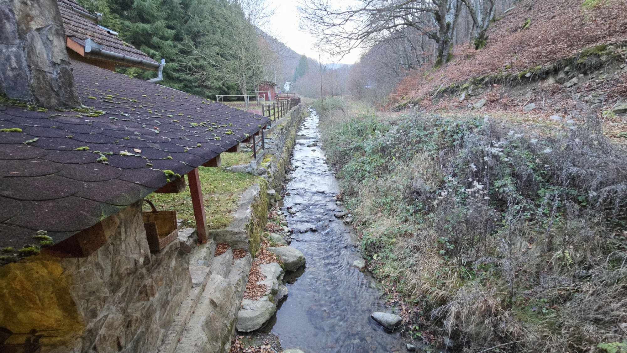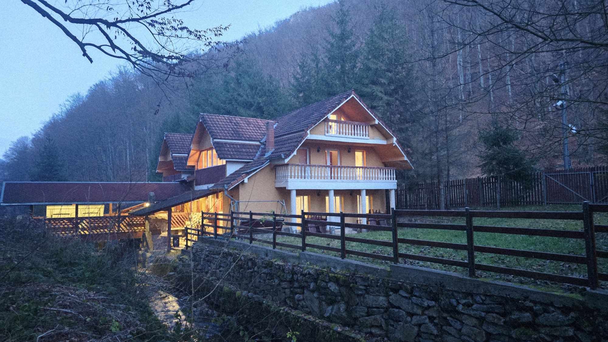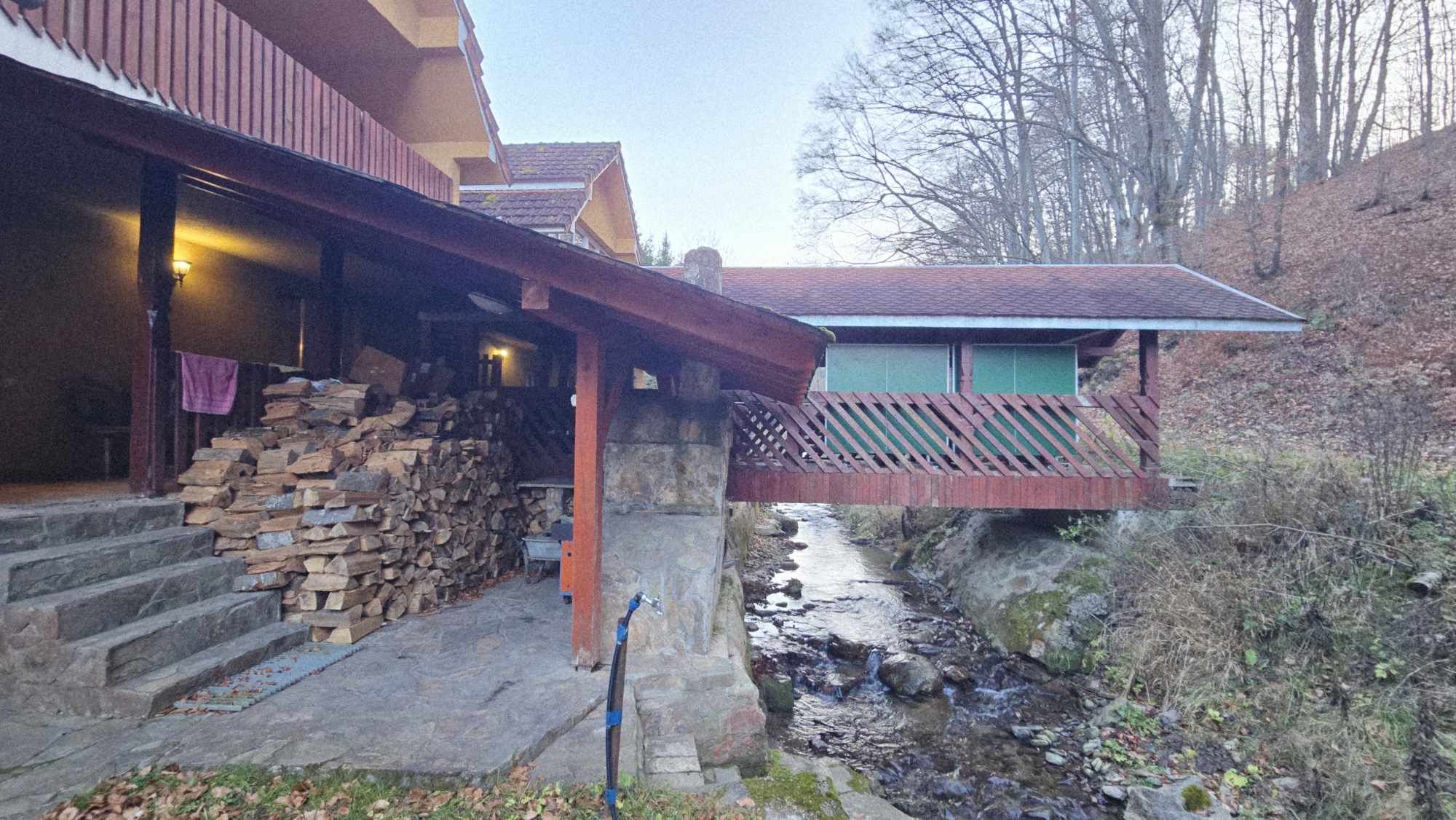 Corpul 1 al primei clădiri dispune de terasă de intrare, cu acces la terasa suplimentară, care este comună cu corpul 2, amplasată în îmbinarea celor două corpuri, peste pârâul care traversează proprietatea. Aici regăsim zona de relaxare, zona de mese, cuptor/șemineu exterior, cameră tehnică cu sala centralei (cu centrală pe lemne) și boilerul pentru apă caldă. Living foarte spațios, cu bucătărie și loc de luat masa în open-space, spațiu de relaxare și șemineu pe lemne, baie la parter, 3 camere la etaj + baie. Fiecare cameră dispune de balcon propriu. Mansardă cu o cameră foarte mare și multiple paturi de dormit, ciubăr pentru 12 persoane, cu LED, funcție jacuzzi și sistem de filtrare.