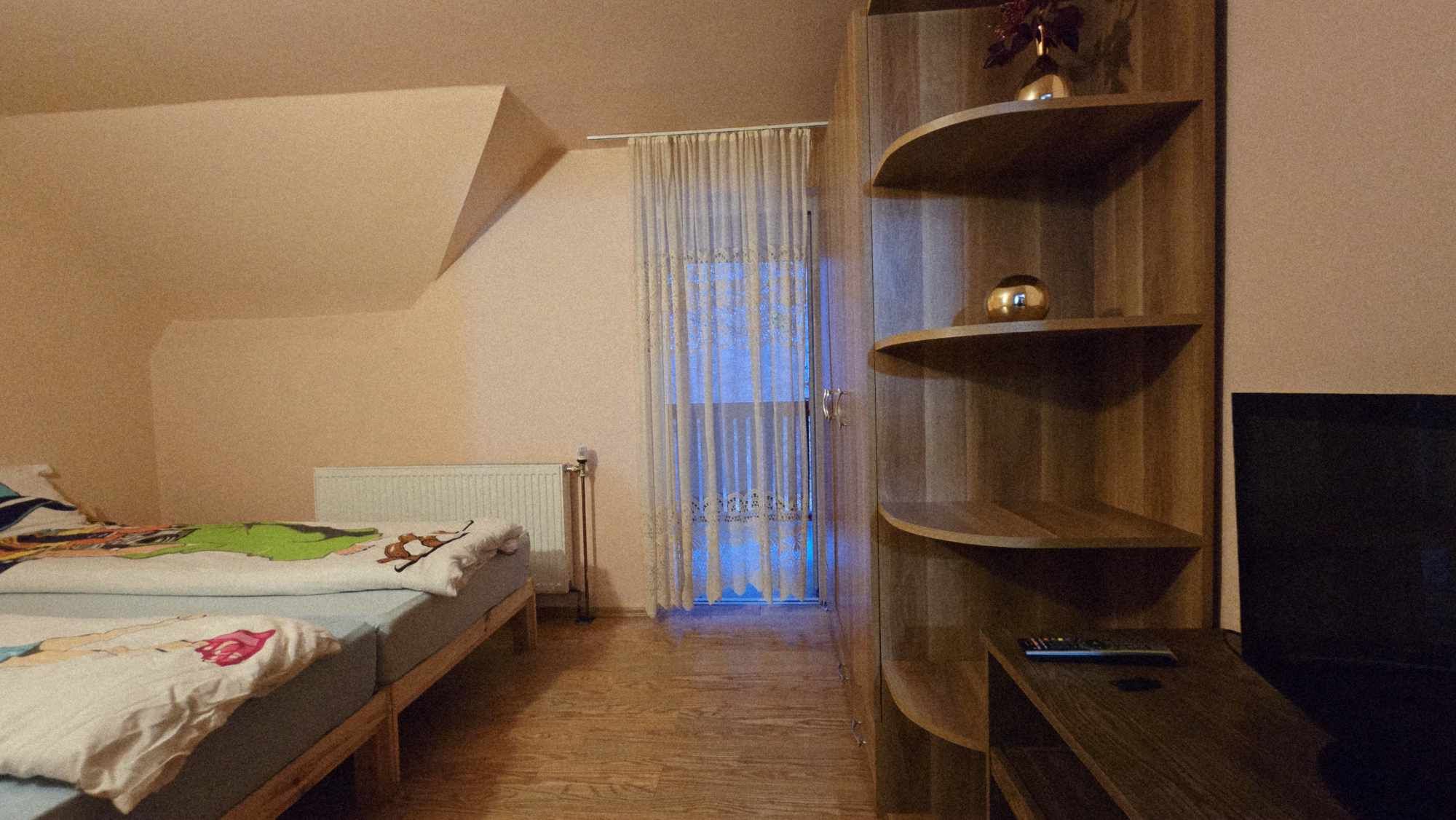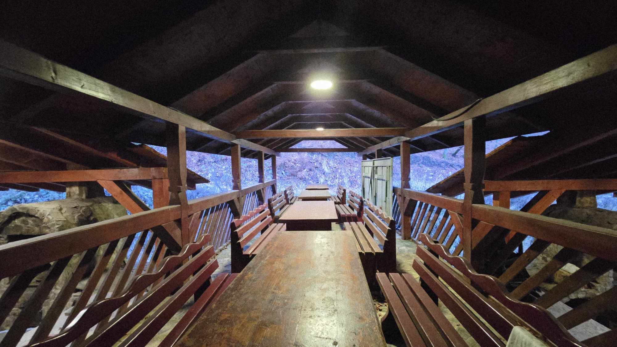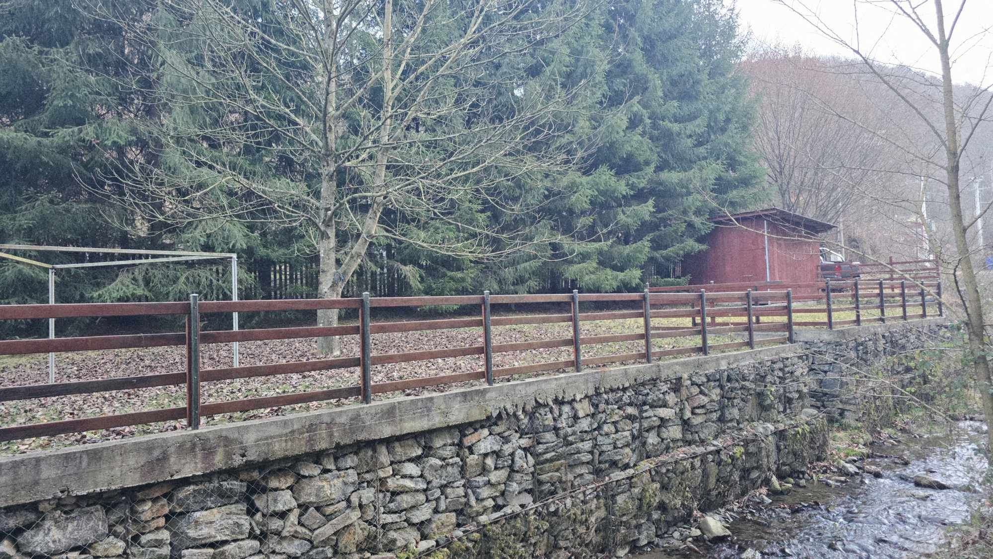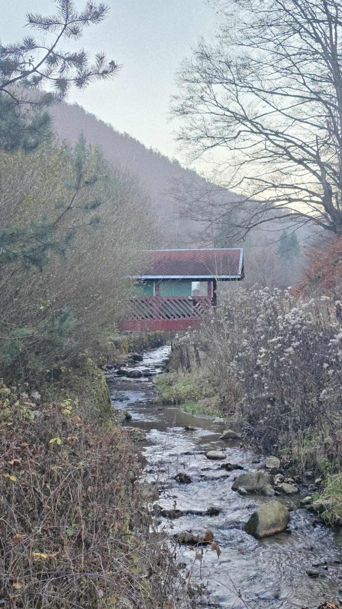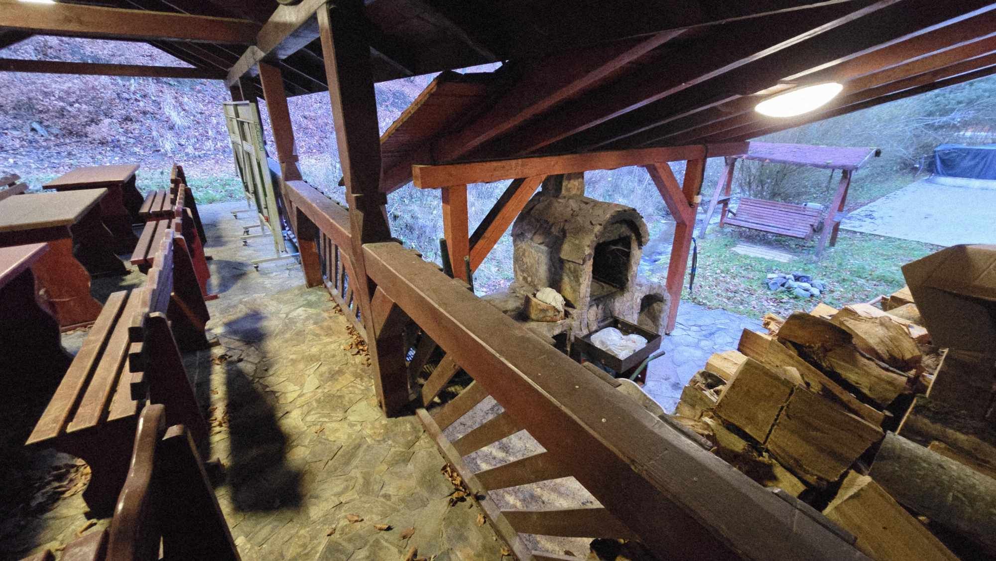 Corpul 1 al primei clădiri dispune de terasă de intrare, cu acces la terasa suplimentară, care este comună cu corpul 2, amplasată în îmbinarea celor două corpuri, peste pârâul care traversează proprietatea. Aici regăsim zona de relaxare, zona de mese, cuptor/șemineu exterior, cameră tehnică cu sala centralei (cu centrală pe lemne) și boilerul pentru apă caldă. Living foarte spațios, cu bucătărie și loc de luat masa în open-space, spațiu de relaxare și șemineu pe lemne, baie la parter, 3 camere la etaj + baie. Fiecare cameră dispune de balcon propriu. Mansardă cu o cameră foarte mare și multiple paturi de dormit, ciubăr pentru 12 persoane, cu LED, funcție jacuzzi și sistem de filtrare.